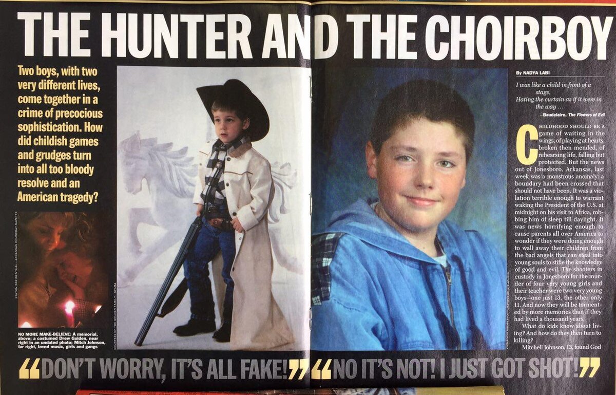 В этом году прошло ровно 20 лет с момента трагедии, которая произошла в американском городе Джонсборо. Это была одна из первых перестрелок в зарубежной школе, о которой в постсоветский период узнали российские граждане из газет и телевидения. 26.03.1998 Бойня в школе США В марте 98-го года газеты вышли с заголовком: "Вчера утром в городке Джонсборо 2 ученика местной школы открыли стрельбу в своём классе" 4 девочки и учительница были убиты, 11 человек ранены Подростков нашли в лесу неподалёку Апрель 1998 Спустя месяц в российских и мировых СМИ писали: В Арканзасе продолжается суд над двумя подростками из Джонсборо, 11 и 13 лет Эндрю Голденом и Джонсоном Митчеллом, убившими в школе 4 учеников учительницу. В тюрьме они просят пиццу и компьютерные игры. Одноклассники террористов впоследствии рассказывали, что Митчелл Джонсон увлекался оккультизмом. На уроках он разрисовывал символикой сатанистов тетради и учебники. Он заявлял своим приятелям, что неизвестный доброжелатель занимается е