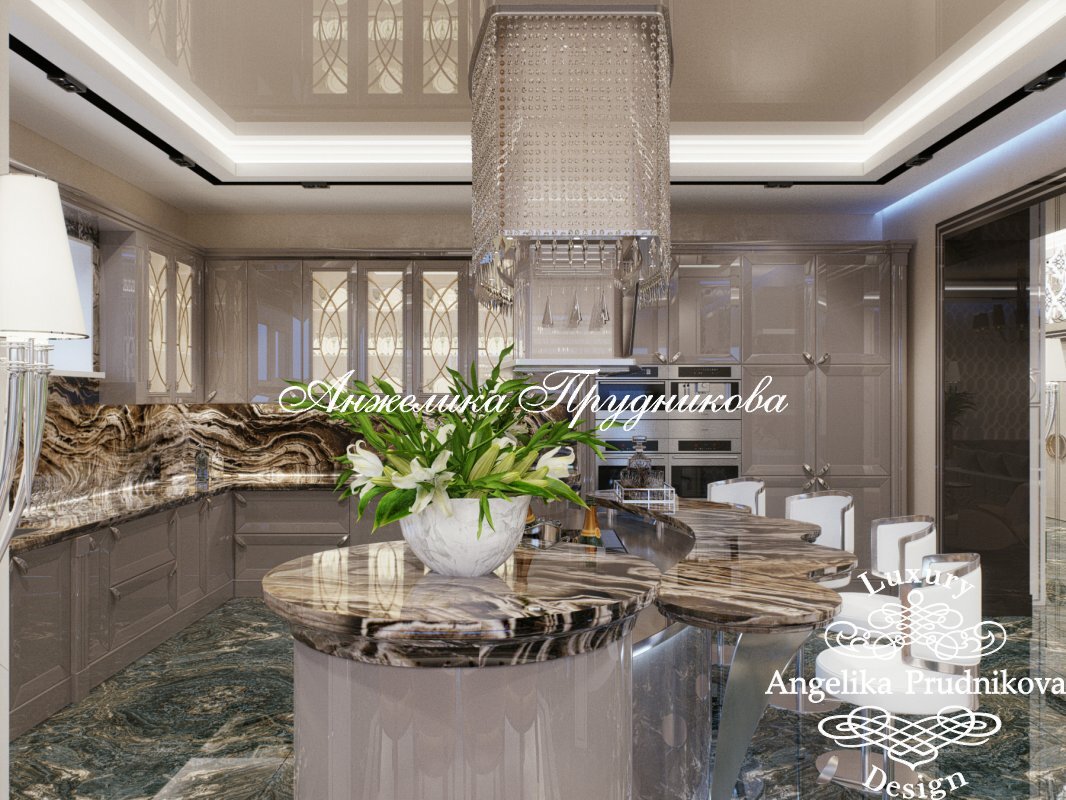 Кухня составляет единое целое со столовой, что позволяет применять в декоре одни и те же мотивы и элементы – большие окна для дневного освещения и массивные оригинальные люстры. Африканские мотивы в отделке рабочей поверхности кухни отлично сочетаются с мозаичным полом и нежной отделкой стен. Полная фотогалерея проекта: https://angelika-prudnikova.design/dizajn-portfolio/dizayn-kukhni/dizayn-proekt-interera-kukhni-v-stile-ar-deko-v-g-bryansk Понравилась публикация? Ставьте лайки и подписывайтесь на наш канал! Телефоны Студии элитных интерьеров Анжелики Прудниковой: +7 (495) 799-33-39, +7 (495) 775-95-33