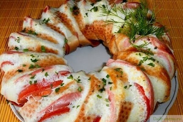 Простейшие продукты и минимум времени - и горячее блюдо на столе, вкусное и красивое. Для бутерброда весом около 1 кг потребуется: 😊 1 небольшой багет, 😊 120 г сыра, 😊 150 г ветчины, 😊 2 крупных помидора, 😊 3 яйца, 😊 120 мл молока, 😊 1 ст.л. сливочного масла, 😊 специи, 😊 соль Приготовление: 1. Батон и сыр нарезать ломтиками, ветчину и поидоры кружочками. 2. Яйца взбить с солью и специями, добавить молоко, перемешать. 3. Смазать маслом форму для запекания. Разогреть духовку. 4. Ломтики батона макать в яичную смесь и выкладывать по кругу в форму, чередуя с сыром, ветчиной и помидорами. Ломтики сыра лучше чуть вытащить наверх, чтобы крайчики торчали. Должен получиться бутербродный "бублик". 5. Форму поставить в разогретую духовку и запечь при 180 градусах примерно 30 минут. Приятного аппетита! Калорийность и БЖУ: На 100 г: 164 ккал, белки: 9 г, жиры: 8.5 г, углеводы: 14.4 г