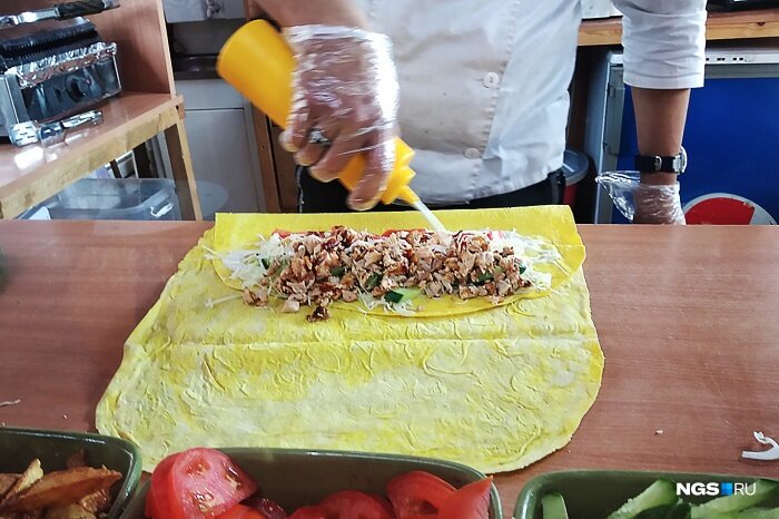 Но видно, что иноземные технологии всё же оставили свой след. Внутри совсем не было картошки, прощупывался йогуртовый соус, но главное, вообще это редкий в данном жанре в Новосибирске случай, когда чувствуешь внутри вкус овощей, а не жира. Набор в целом стандартный: помидоры, огурец, плюс укроп и острая морковь.