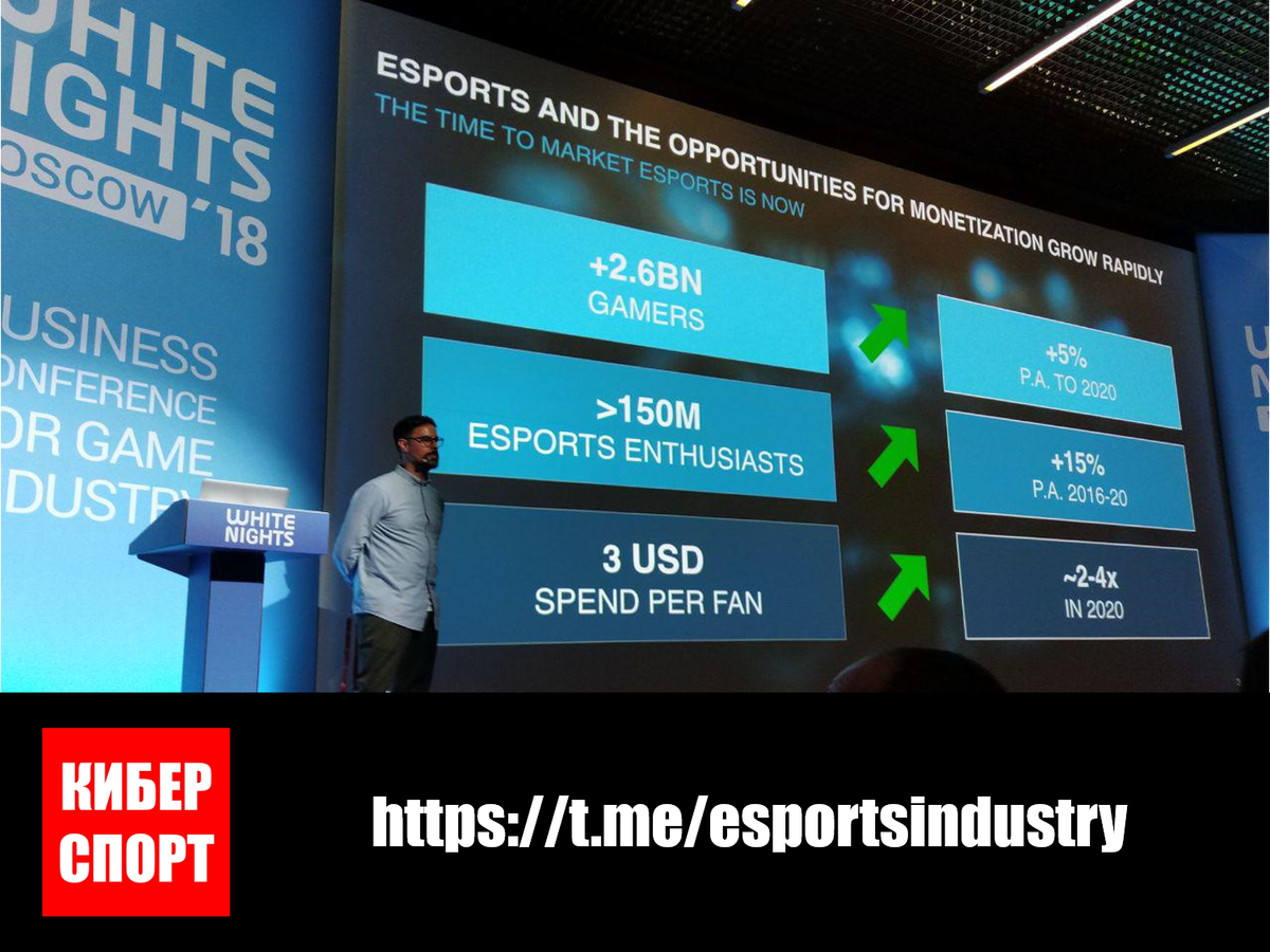 Как зарабатывать на киберспорте и какие к этому есть предпосылки? Об этом рассказали на киберспортивной сессии бизнес-конференции White Nights. Шон Чарльз, старший вице-президент ESL, дал отличный обзор индустрии в цифрах и трендах. — В мире 2,6 млрд геймеров и их количество растёт с темпом 5% в год. Это отчасти киберспортивный потенциал (но никто не говорит, что все они – потенциальная аудитория киберспорта; просто они ближе к ней, чем те, кто не геймер вообще). Также в мире 150 млн «киберспортивных энтузиастов» (это реально вовлечённая киберспортивная аудитория) и их количество с 2016 по 2020 год растёт и будет расти на 15% в год. — 81% киберспортивной аудитории находятся в возрасте от 18 до 34 лет. Это коррелирует с результатами российского исследования Nielsen. Средний возраст – 25 лет. Более 70% – мужчины. — Средний доход от представителя киберспортивной аудитории составляет $3, к 2020 году этот показатель вырастет в 2-4 раза. Интересно, что Citi в своём отчёте Disruptive Innovat