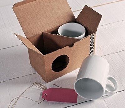 Специалисты из испанской компании SelfPackaging, реализующей через свой интернет-магазин стильные, но недорогие решения оформления подарочной упаковки, предлагают оригинальную коробку для упаковки сразу двух кружек. Коробка изготовлена из гофрокартона, у нее откидная крышка и боковое отверстие-окошко. А для того, что бы кружки не соприкасались при транспортировке, в комплекте с коробкой идет вкладыш-разделитель из того же гофрокартона. Для придания праздничного настроения коробке SelfPackaging тут же предлагает материалы которые помогут ее украсить подходящим образом.