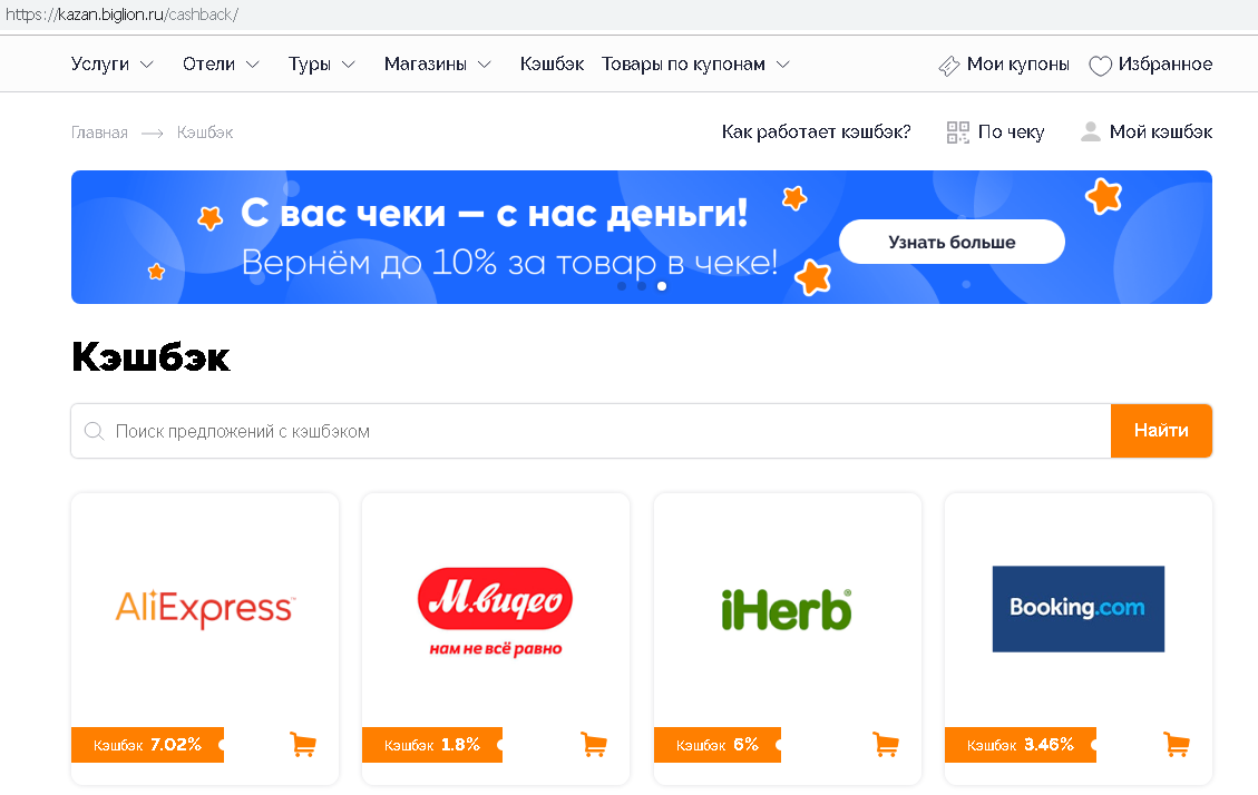 1. Первый в моем списке - Biglion.ru. Да-да! Эти ребята уже давно не только торгуют купонами, но и запили свой кэшбэк-сервис, у которого, на сколько мне известно, самые большие ставки вознаграждения в рунете. Второй плюс - это возможность получать кэшбэк за сканирование QR-кода с любого чека, как онлайн, так и оффлайн. 1 руб. платят за любой чек + акции по отдельным товарам. Также помимо магазинов у сервиса есть и финансовые предложения. Например, можно взять кредит в банке и получить жирный кэшбэк. При этом у Biglion не очень много партнёров, а вывести кэшбэк с этого сервиса - это настоящие танцы с бубном: запросы в поддержку, письменное заявление. Зато баланс кэшбэка можно легко потратить на купоны и очень не дурно сэкономить!