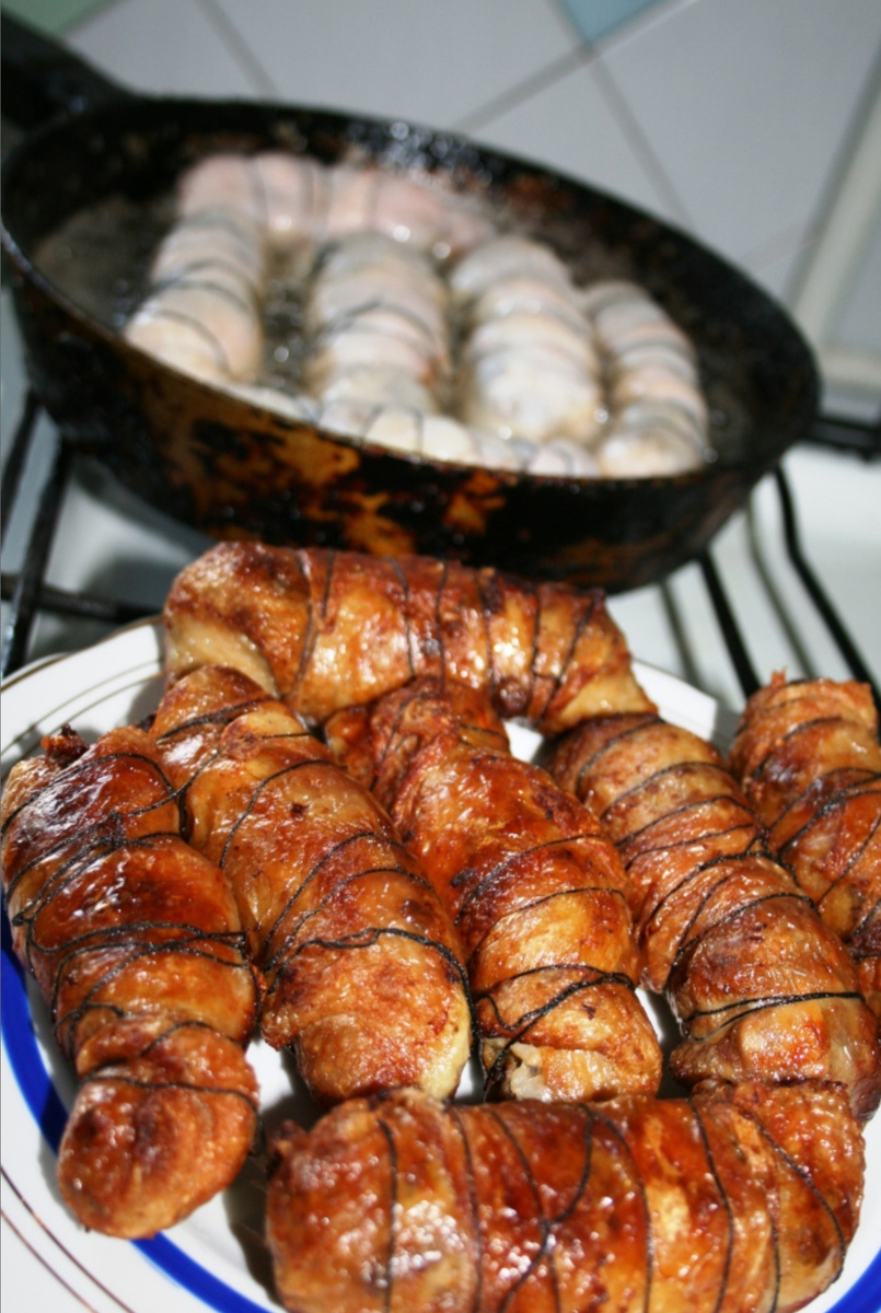 Разложив куриную шкурку на доске, выкладываем на центр кожи пару ложек фарша и затем заворачиваем «конвертом». Чтобы в процессе готовки наши сардельки не расползлись по таре, скручиваем сардельки суровой ниткой. Можно использовать зубочистки.