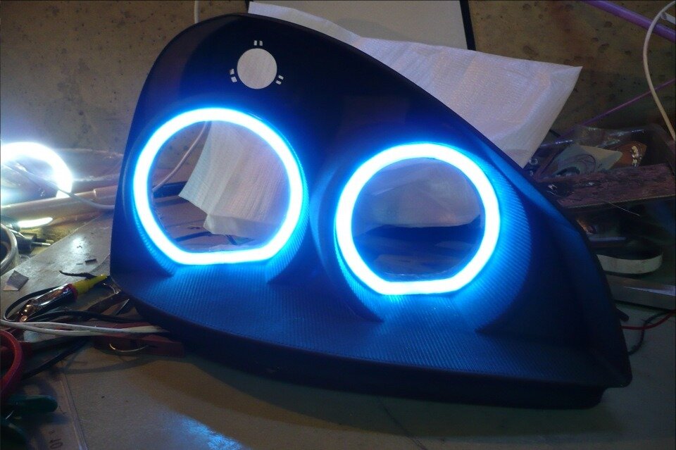 Установить оптику под название "Глаза ангела" на автомобиль может любой водитель. Ведь данное приспособление даст возможность, создать свечение, которое можно заметить даже ночью. Преимуществом этой фары с кольцами, является ее энергосберегаемость. Ее можно купить как в магазине, так и сделать самому. Для этого понадобятся, следующие материалы: - Прозрачные трубки с длиной от 45 сантиметров. - Несколько резисторов по 220 Ом - Инструменты, такие как отвертка, плоскогубцы - Скотч или изолента - 4-5 светодиодов Перед началом работ необходимо нарезать несколько листов из оргстекла, после чего придать им круглую форму. Необходимо установить светодиоды на полученные плоскость. Для этого можно взять цветные провода для лучшего эффекта. Завершающим действием, необходимо скрепить все светодиоды вместе.