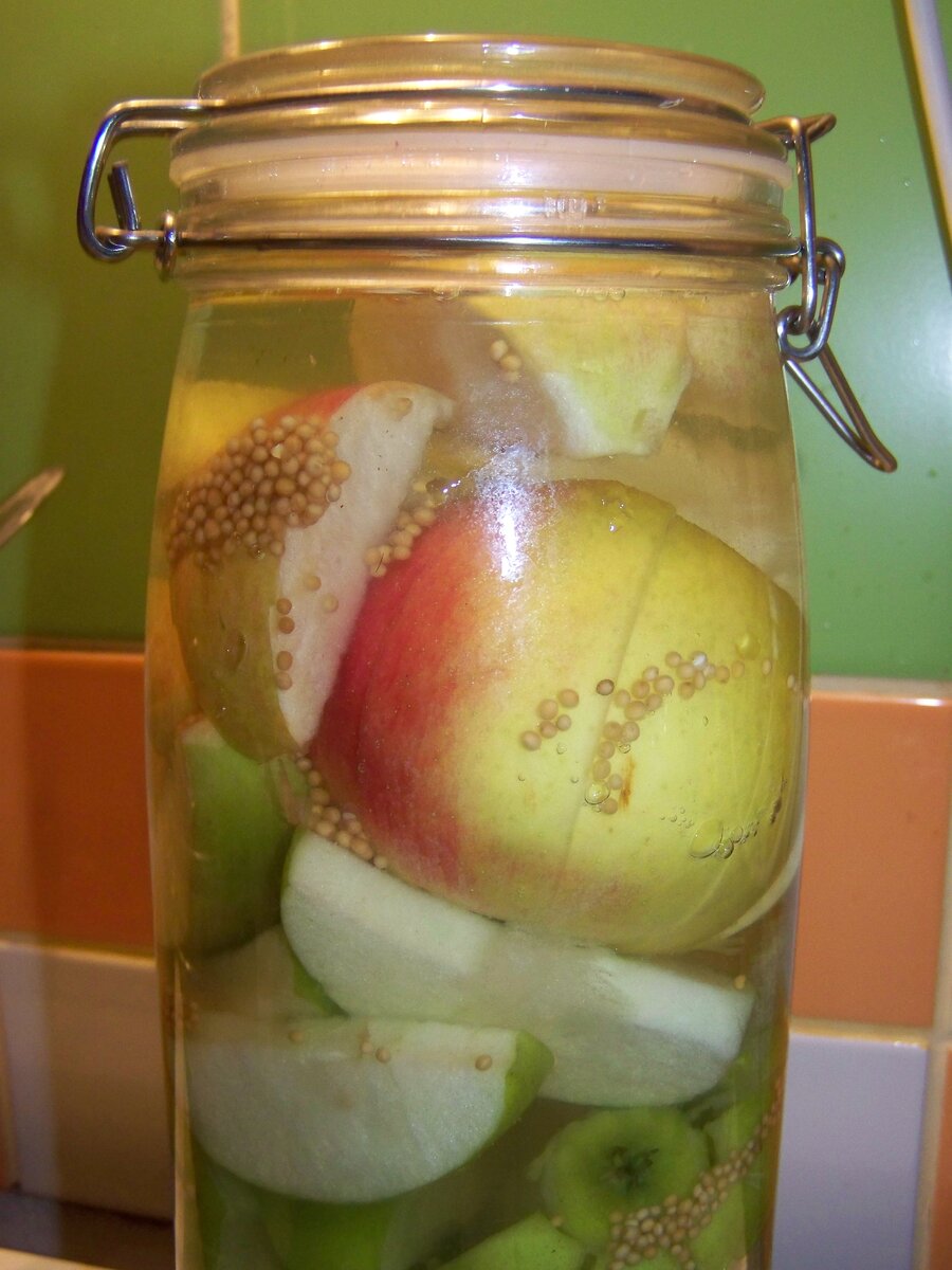 Пора мочить яблоки. Будь то ароматнейшая Антоновка или сочный Богатырь, рецепт в нашем доме старый и проверенный. Есть рецепты проверенные, передающиеся от бабушки к внучке. Но, как правило, процесс мочения довольно длительный. А хочется быстро, вот чтобы прямо через недельку можно было вкусить этого русского продукта. И у меня есть такой экспресс-рецепт. Что нужно сделать? В кастрюльке вскипятим воду. На один литр добавим чайную ложку соли с горочкой, 2 чайные ложки чуть раздавленных скалкой зерен горчицы, покипятим пару минут. Снимем с огня, растворим в рассоле 1 столовую ложку меда. Охладим.
