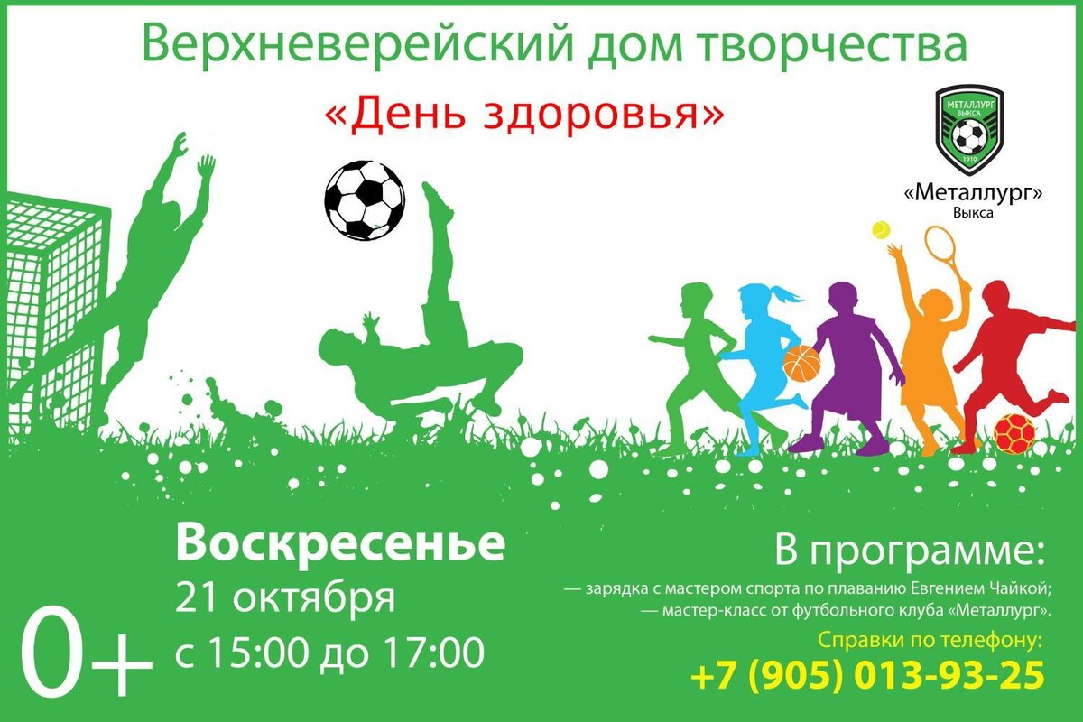 15:30 — мастер-класс от футбольного клуба «Металлург». Днём ранее, 20 октября, в Верхней Верее пройдёт мастер-класс по настольному теннису. Его проведет основатель футбольной и теннисной династии Владимир Давыдов. Начало в 15:00. Справки по телефону: +7 (905) 013-93-25.