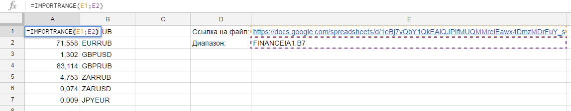 Так, если в ячейку A2 вы введете ссылку на документ, из которого нужно загрузить данные, а в ячейку B2 — ссылку на лист и диапазон, то загружать данные можно будет с помощью следующей формулы: