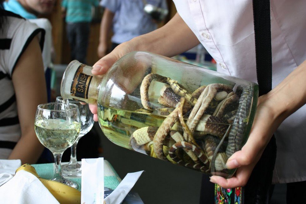 ЕСЛИ ТАКИЕ НАПИТКИ ДЕЛАЮТ ЗНАЧИТ КТО ТО ИХ ПЬЕТ . 1 .ВОДКА С КОБРОЙ. Мороз по коже , название -жутковатое . Делают такую водочку в основном в Азии там она чрезвычайно популярна .Главная фишка водки -ядовитая змеюка помещенная в бутылку и залитая спиртом или рисовой водкой . Но основная изюминка - это яд растворенный в водке Главный продукт это -кобра (почему кобра наверно в ней яда больше). Многие беспокоятся а не отравишься нет не отравишься ,ведь яд в спирте нейтрализуется во время настаивания . Если налить водку в стакан на вид она желто -маслянистая жидкость ,вкус рисовой водки с горчинкой .