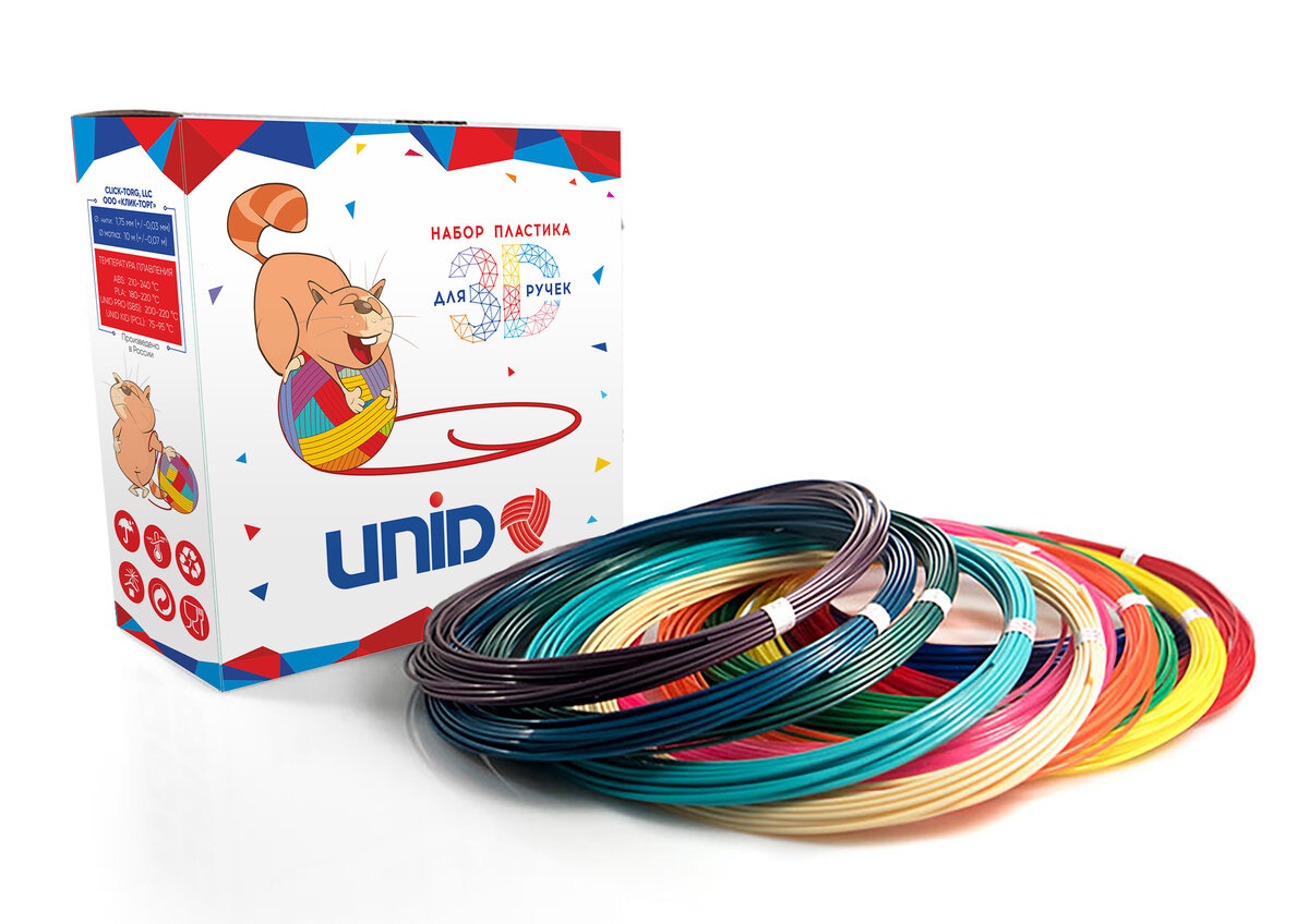 UNID ABS Температура плавления: 210 - 230 градусов. Цвета плотные, не прозрачные, сочные. ABS - самый распространенный материал. Из него создают конструктор Лего и игрушки, канцтовары. При нагревании пахнет пластиком. Работы получаются прочные и долговечные. UNID PLA Температура плавления: 190 - 200 градусов. Цвета плотные, не прозрачные, глянцевые. PLA - органический, биоразлагаемый материал. В основном делают из кукурузы. При нагревании пахнет жженым сахаром. Работы получаются красивые, но не надежные, разрушается в т.ч. от солнечных лучей. UNID PRO Температура плавления: 200 - 220 градусов. Цвета глянцевые, полупрозрачные, карамельные. PRO - относительно новый материал, идеальный для 3D ручек, эластичный и прочный. Работы получаются красивые, витражные и крепкие. При нагревании имеет слабый запах. UNID KID Температура плавления: 80 - 90 градусов. Цвета плотные, не прозрачные, матовые. KID - детский пластик, не имеет запаха, низкотемпературный, можно рисовать хоть на руке. Многоразов