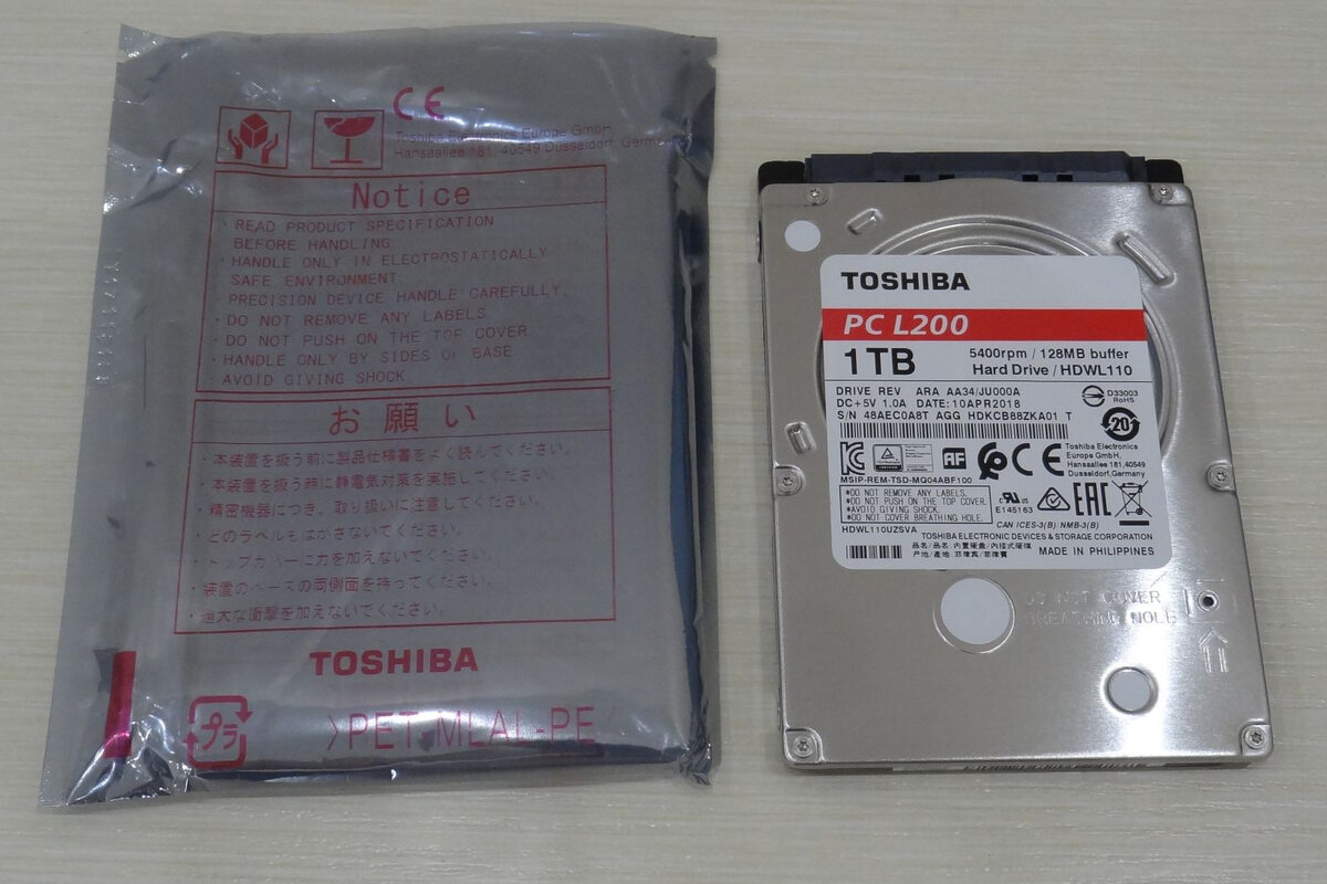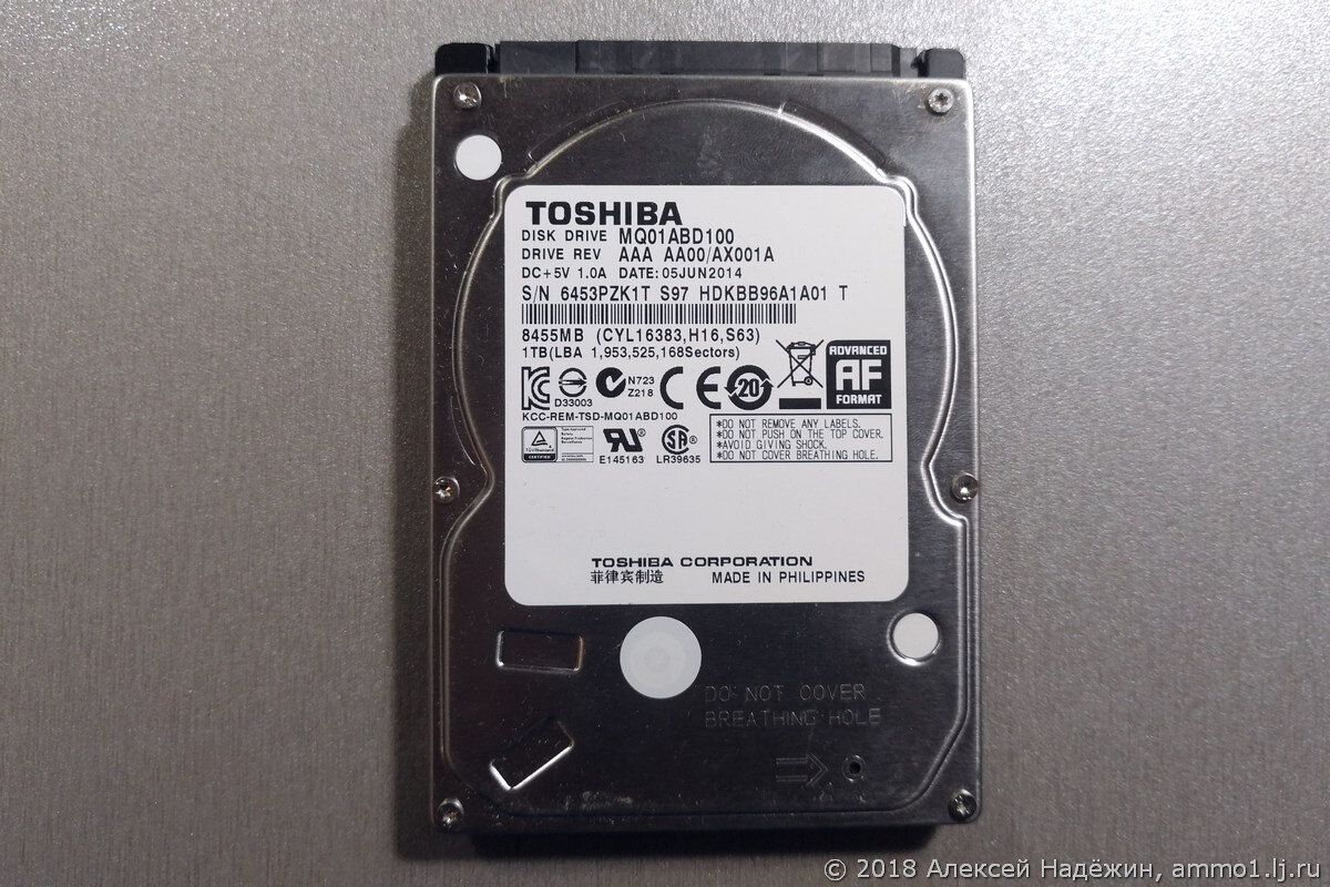 Чтобы компьютер был максимально тихим, я установил в него ноутбучный 2.5-дюймовый жёсткий диск Toshiba MQ01ABD100, ёмкостью 1 ТБ.