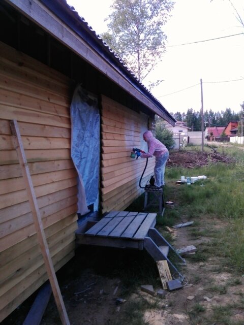 Мы использовали систему финского производства TEKNOS. Первым слоем (на нижние венцы — вторым, после антисептика) мы наносили адгезионный грунт TEKNOL 2881. И, таки-да, для покрасочных операций мы тоже прикупили соответствующий инструмент и экипировку.