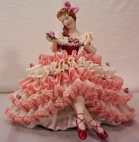 Этот удивительный фарфор, который кажется таким невесомым и легким, называют иначе «Дрезденским фарфором», именно в городе Дрезден в начале XVIII века и был разработан секрет его изготовления. В этом же столетии приступили к массовому изготовлению статуэток. В основном это были фигурки знатных особ, балерин, танцовщиц,актрис,музыкантов, которые в основном и носили такие пышные наряды из тончайшего кружева.
