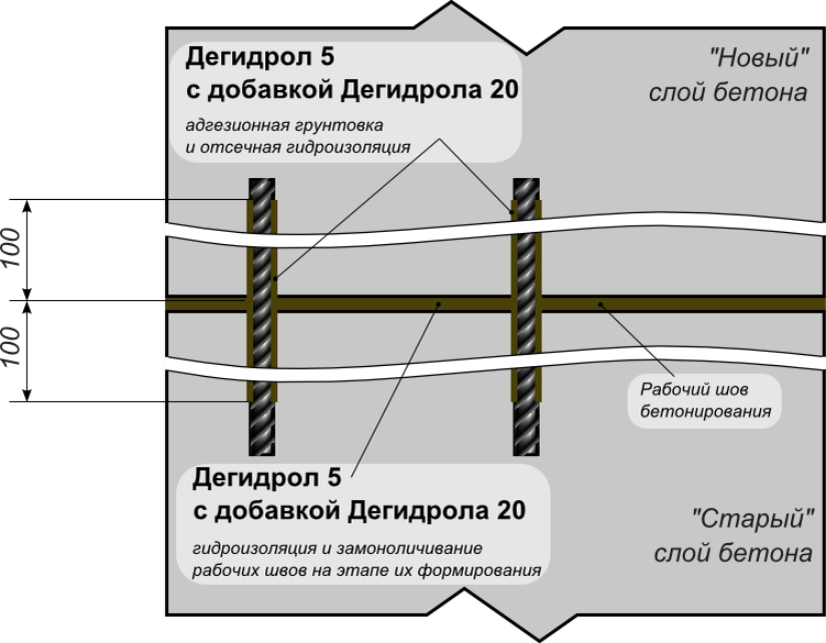 - Выполнить бетонирование не позднее чем через 2 суток после нанесения слоя Дегидрола. Для предотвращения образования пустот при бетонировании применять эффективное виброуплотнение, дополнительно рекомендуется использовать уплотняющую добавку для бетона - Бетоноправ люкс марки 4 (расход 4 кг на 1 м3 бетонной смеси).