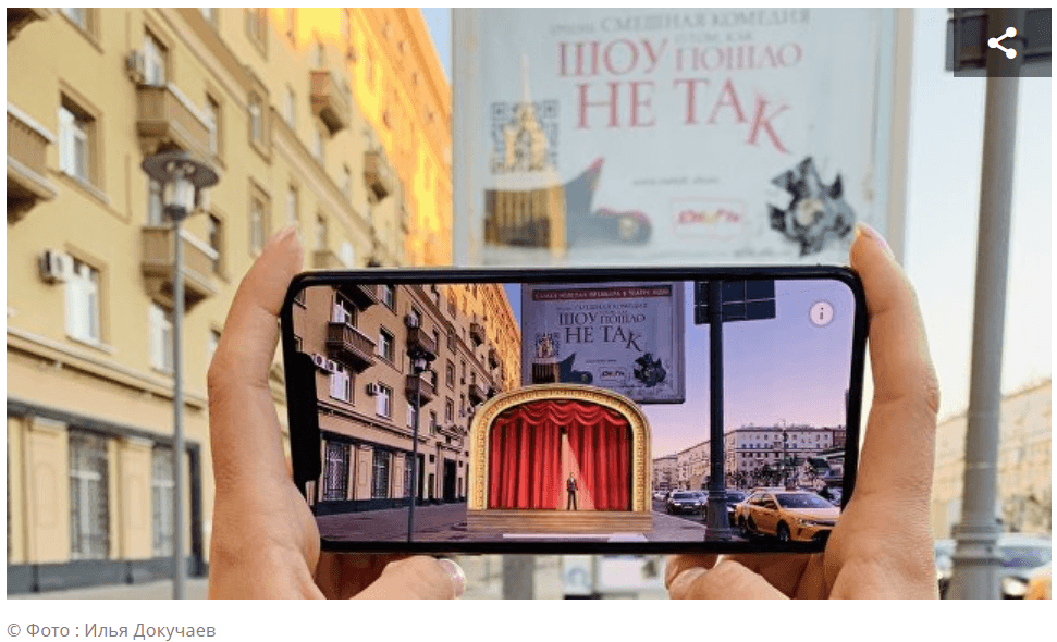 Технология AR (augmented reality) впервые появилась в наружной рекламе театральной постановки. Это сделали московские театральные компании «Московский Бродвей» и «Фэнси Шоу». С 18 октября владельцы iPhone и iPad могут «оживить» афишу спектакля «Очень смешная комедия о том, как ШОУ ПОШЛО НЕ ТАК». Для этого нужно сканировать QR-код на билборде и скачать приложение, после чего перед вами развернется целое представление. В финале 3D-сюжета создатели обещают приятный сюрприз. Над AR-афишей работала студия ArPoint и рекламное агентство «ЛАЙСА». Как шутят представители «Московского Бродвея», теперь их театр начинается «не с вешалки, а с дополненной реальности театральных афиш». Это призвано изменить привычный подход к коммуникации и дополнить традиционную рекламу диджитал-маркетингом.