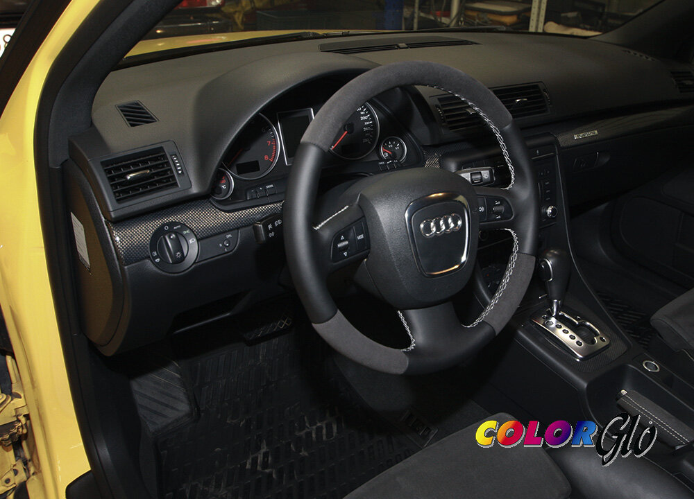 ПЕРЕТЯЖКА РУЛЯ НА АВТОМОБИЛЕ AUDI A4 DTM EDITION – В АВТО-АТЕЛЬЕ COLOR GLO RUSSIA Реализована задача по перетяжке руля в полноприводном Audi A4 DTM Edition, цвет кузова гельб. Материалы перетяжки руля: · Автомобильная кожа Hans Rainke, черная · Алькантара ® · Отделочная строчка: немецкий шов, нить белая. Сделано ЗА ОДИН ДЕНЬ, включая демонтаж и монтаж руля на штатное место! Hans Rainke (Германия) – один из самых известных европейских брендов, сертифицированный производитель кожи для промышленности и мастерских. Продукция соответствует мировым стандартам. Авто-ателье компании Color Glo Russia постоянно использует кожу Hans Rainke для ремонта и реставрации салонов автомобилей, в том числе, для перетяжки рулей. Кожу и алькантару получаем напрямую от поставщика, что гарантирует высокое качество и конкурентные цены на нашу работу. Рекомендуем обратить внимание на услугу УСТАНОВКА ПОДОГРЕВА РУЛЯ. Выполним заказ ЗА 1 ДЕНЬ! О других вариантах перетяжки читайте в нашей ленте, а также на