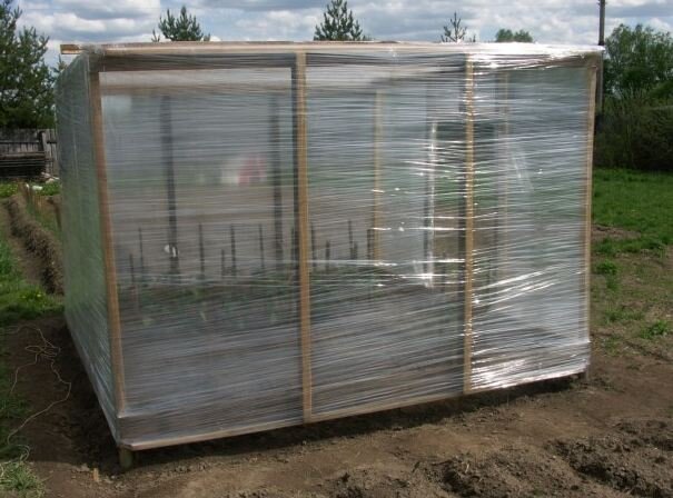 Для того чтобы не испортить помидоры и огурцы не стоит их сажать вместе. Для овощных растений лучше использовать несколько разных парников. Так как они плохо влияют на друг друга. Да и погода в последнее время не очень радует. Особенно ночные заморозки летом. В парнике растения куда быстрее дадут свои плоды. Знакомый товарищ решил хорошенько с экономить на парнике и сделал своими руками очень удобное помещение для растений. Для этого он взял: Она подходит больше, чем обычный полиэтилен. Плюсы: не рвётся после первого сезона, и не рассыпается на второй сезон от прикосновения рук. Стоит дешевле чем обычная парниковая пленка. Хорошо растягивается. При покрытии многих слоев образуется воздух, от которого в парнике сохраняется больше тепла. Устанавливается пленка просто обмоткой всего парника в несколько раз. Не нужно прибивать гвоздями, так как она хорошо слипается между собой. Для того чтобы начать обмотку каркаса парника, желательно начать обматывать с крыши. Для начала нужно зафи