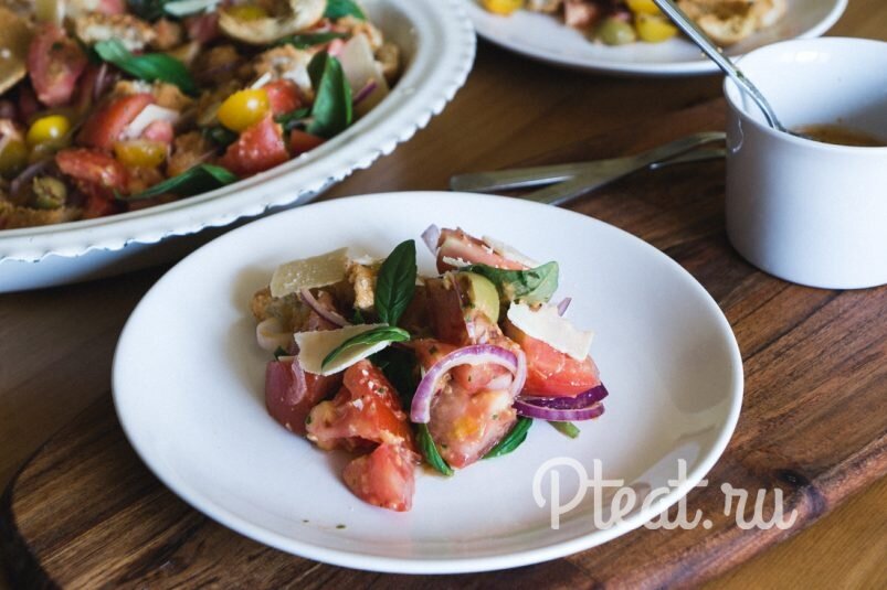 Осень - сезон сбора урожая. Свои плоды всегда располагают к кулинарным приключениям. Из них (плодов:)) получаются самые вкусные заготовки, блюда и семейные ужины. Сочно, быстро и необычно! Пожалуй, именно такой девиз я придумала для этого блюда. Салат из томатов — для меня настоящее спасение и большое открытие в этом году. Итальянцы называют его Панцателла. Рецептов и вариаций на эту тему огромное множество и каждый по своему уникален. Что мне нравится в этом салате, ингредиенты здесь самые что ни на есть итальянские: спелые томаты, свежая зелень, хрустящая чиабатта и ароматный пармезан. Что ещё нужно для счастья любителю тосканского урожая? Разве что тёплый вечер, бокал отличного вина и весёлая компания. Этот салат станет отличным помощником в спасении зачерствелого хлеба. В Тоскане панцателлу готовят необязательно из свежего хлеба, наоборот, используют подсохшие кусочки, размачивают их в воде, оливковом масле и красном винном уксусе. А после отжимают и добавляют к остальным ингредие