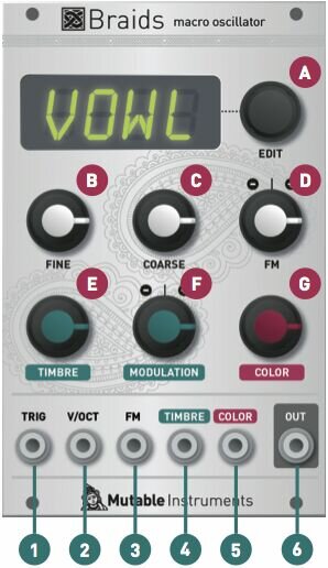 Braids - это цифровой источник звука, управляемый напряжением. В нем представлены 45 моделей синтеза сигналов, которые охватывают такие методы, как FM, волнообразный синтез, или аналоговая эмуляция. Большинство моделей синтеза построены с одним или несколькими осцилляторами, подключенными через кроссфейдеры, модуляторы, фильтры или линии задержки. Каждая модель синтеза управляется двумя параметрами, называемыми Timbre и Color. Большую часть времени Timbre будет влиять на яркость звука.