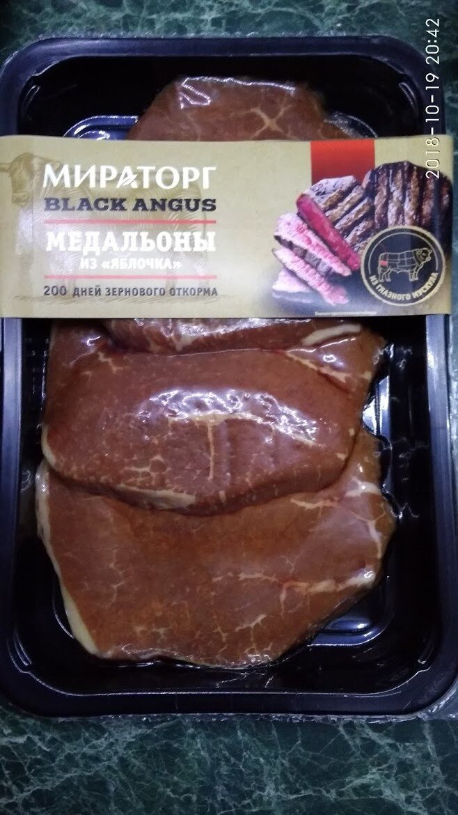 В этот раз я решил купить медальоны из яблочка, фирмы мираторг. Цена за упаковку 449 руб. Говяжье яблочко - это часть задней ноги. В нем имеются тонкие жировые прослойки, которые при кулинарной обработке растворяются и делают мясо сочным, нежным. Вот такие вот отличные куски. И так, прежде чем готовить, мясо надо достать его из холодильника и дать остыть до комнатной температуры. После промокнуть кусочки бумажным полотенцем. В это время разогреть сковородку, она должна быть раскаленной. Это смесь соли и перца Вот что получилось. Мне они понравились, мясо сочное получилось, сытное. Осилил только 2 куска. Всем приятного!