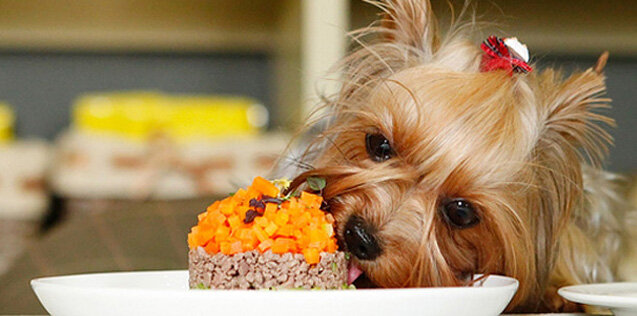 Если в домашних условиях йорк питается натуральной едой, то при составлении ежедневного меню строго придерживаются соотношения 2:1:1 (мясо-крупы-овощи). В недельное расписание включают до 3-4 комбинаций различных блюд.
