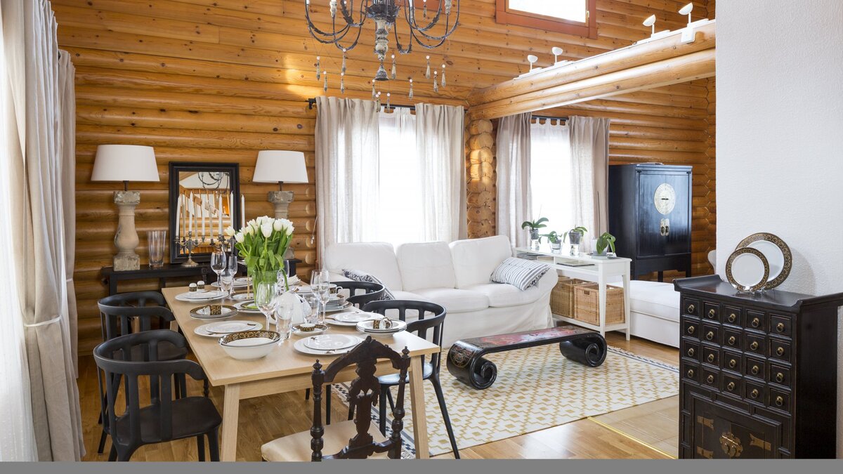 Хорошо, если мебель будет из необработанного дерева. При помощи машинки для выжигания ножкам стульев или столешнице можно придать эффект изъеденности жучками. Шикарным акцентом станет плетеное кресло, в углу можно расположить корзину с нитками для вязания или теплым пледом. Кстати, лучше, если в таком интерьере не будет синтетических тканей и современных принтов. Пусть все будет немного «бабушкино»: можно купить тканые половики, скатерть с вышивкой, сервиз с неброским цветочным рисунком.