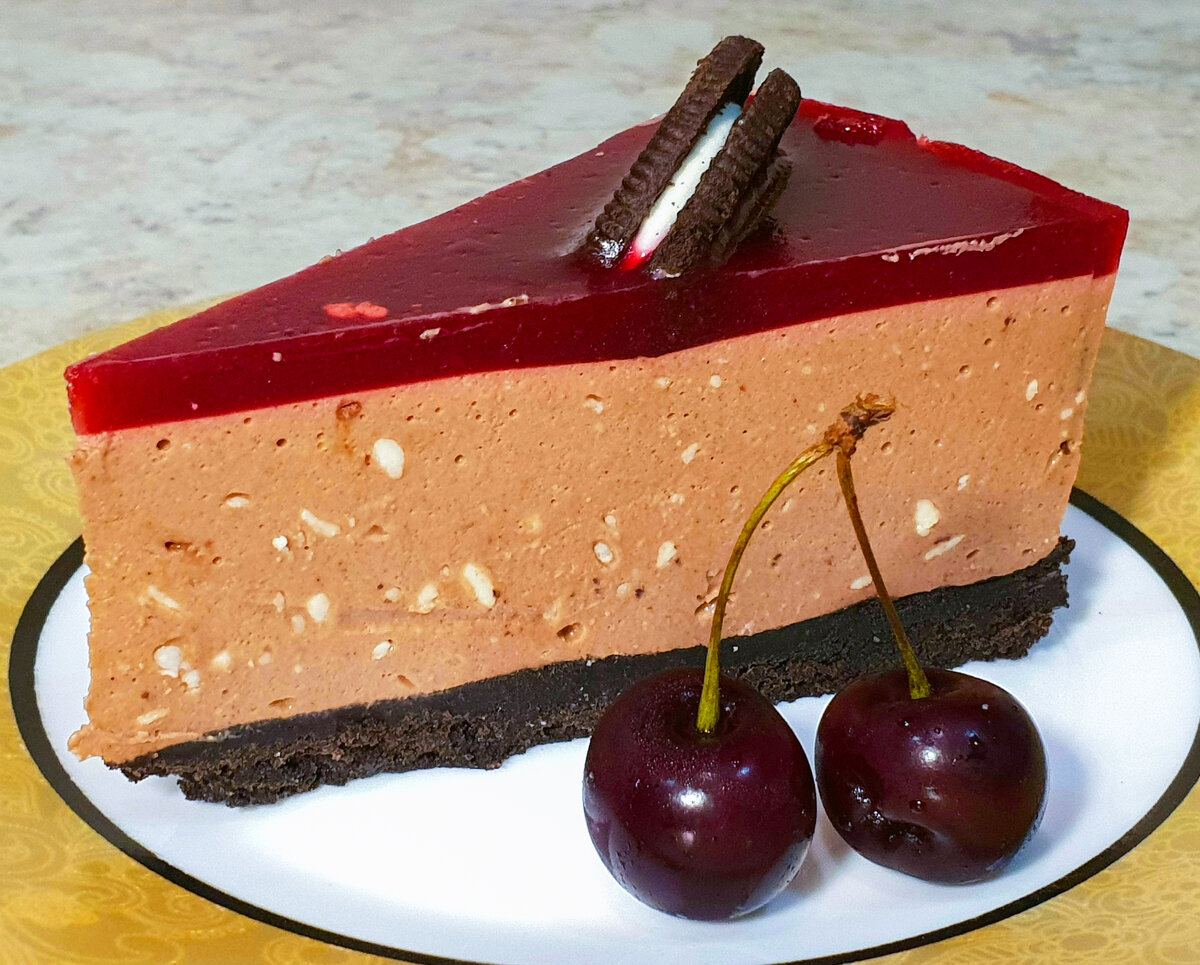 Моя дочка (помимо всего прочего) любит две вещи: шоколад и печенье Oreo. Поэтому выбор торта к ее дню рождения был очевиден: чизкейк с шоколадным суфле и бисквитом из печенья Oreo. Если вы любите шоколад, вам точно понравится такой чизкейк. Не забывайте поставить лайк этой публикации и подписаться на канал, если мои рецепты вам понравились. Вам не трудно, а мне приятно :) И не бойтесь экспериментировать на кухне, а потом делиться своими рецептами. И обязательно попробуйте этот рецепт. Напишите в комментариях, как получилось. Основа: Суфле: Желе: Приступаем к основе. Печенье извлеките из упаковок и отделите начинку от самих печенек. Собственно печенье пойдет на основу, а начинку пока отложите в сторону (но не съедайте и не выбрасывайте). Печенье измельчите с помощью погружного блендера как можно мельче. Добавьте в него растопленное сливочное масло. Хорошо перемешайте. Переложите будущую основу в разборную форму и плотно утрамбуйте с помощью столовой ложки или лопатки. Чем сильнее вы у
