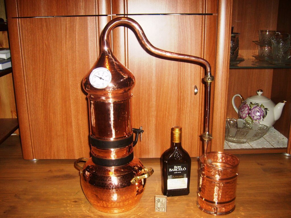 Простая конструкция, состоящая из змеевика и перегонного куба. Она обладает примитивным принципом работы: сусло нагревается в емкости до кипения спирта, происходит испарение, пар поступает в холодильник по змеевику, охлаждается, превращаясь в спиртсодержащую жидкость.