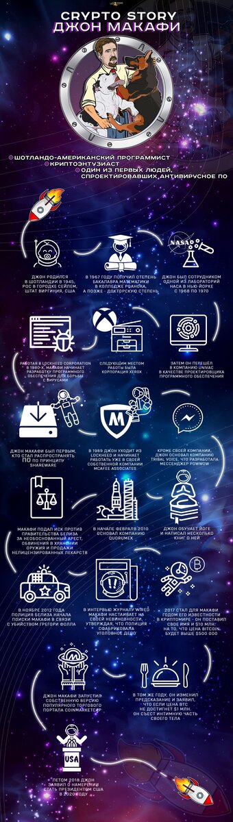 The Coin Shark продолжает делиться яркими «Crypto Story» известных проектов и криптоэнтузиастов в формате космической истории. Мы уже рассказали о создателе Эфириум Виталике Бутерине и биткоин-евангелисте Роджере Вере. Сегодня мы поделимся историей жизни скандально известного, эксцентричного и непредсказуемого Джона МакАфи, который свято верит в будущее Биткоина и криптовалют, а также, возможно, станет новым президентом Америки в 2020 году. Источник: wikipedia.org