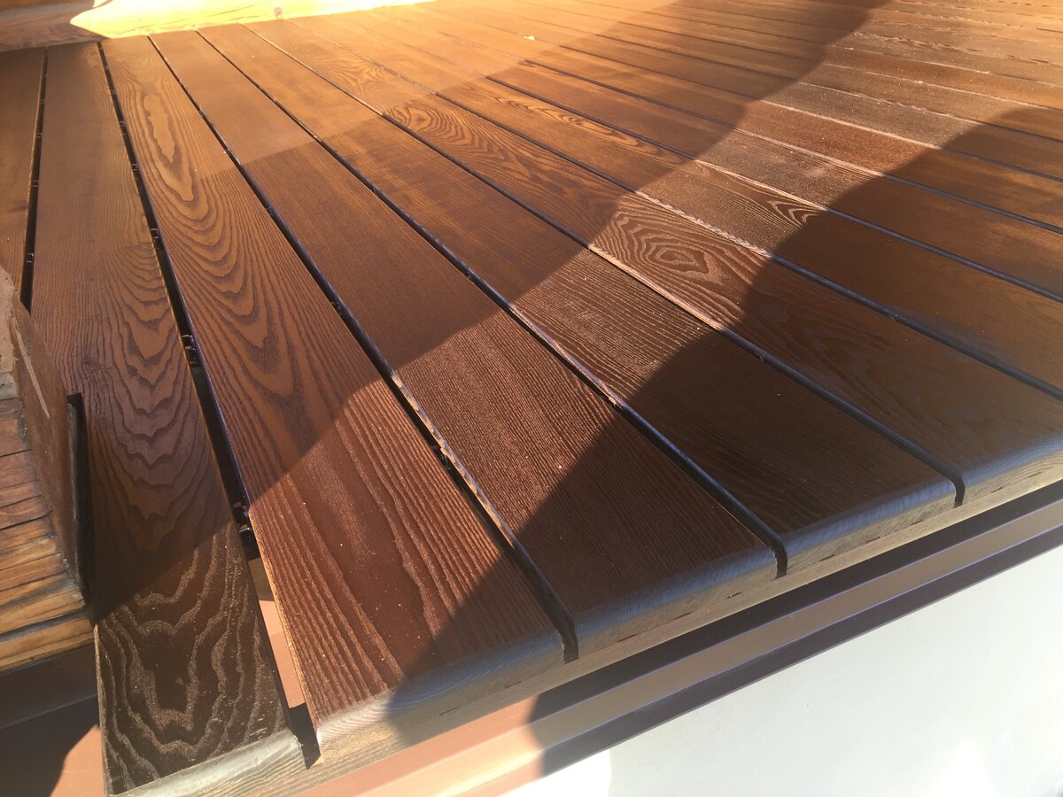 Термодоска (термодревесина) – натуральный, экологически чистый материал, обладающий рядом преимуществ по сравнению с обычной древесиной. Получают данный материал путем термической обработки (перенасыщенным паром 180-230 C) обычной древесины. В процессе обработки дерево приобретает естественную тонировку на всю толщину. Купить термодерево можно практически в любом крупном строительном магазине. Данный материал уже довольно широко распространен в нашей стране. Достоинства термодоски Повышенная устойчивость к механическим воздействиям, истиранию, а также к биологическому воздействию. Термодревесина не поражается насекомыми, плесенью, грибком и другими микроорганизмами. За счет высокотемпературной обработки, в древесине разлагаются полисахариды, что на фоне низкого равновесного уровня влажности полностью устраняет условия для жизни микроорганизмов. Такая устойчивость позволяет отказаться от специальной химической обработки древесины. Долговечность эксплуатации в 20 раз выше, чем у обычног