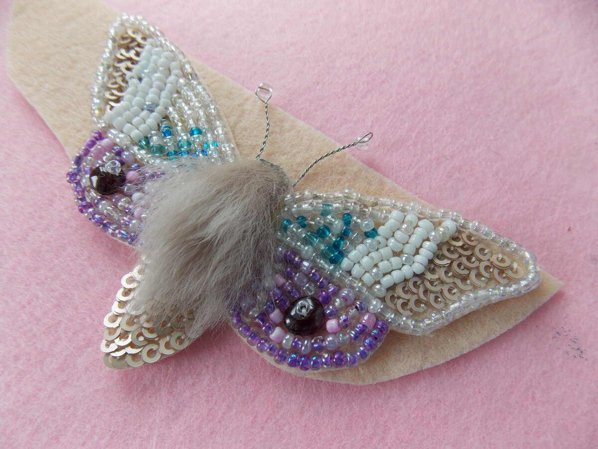 Привет всем! По-моему в мире есть три красоты - цветы, бабочки и кошки. Они прекрасны. В этот раз меня вдохновили бабочки - моли, у них своя красота...Она не броская... И так, для основы я взяла плотный фетр, нарисовала силуэт бабочки и начала заполнять бусинами, бисером и пайетками. Я всегда вышиваю по наитию, без схем и планов... Так интереснее получается. Когда основа вышита, на тельце бабочки приклеиваю кусочек меха, как у моли. Усики делаю из проволоки и бисера, приклеиваю их с обратной стороны. Затем обрезаю маникюрными ножницами все лишнее. Чтобы брошь не заламывалась, для жесткости, с обратной стороны можно приклеить картон или пластик от коробок. Он должен быть на 1-2 мм меньше заготовки. Это необходимо для последующего обшивания краев броши бисером. Дальше приклеиваем еще один слой фетра и вырезаем по контуру нашей моли. В итоге получилось так. Обшиваем края броши бисером. Я беру по две бисеринке и прохожу по всему краю. Когда все сделано. Остается только пришить застежк
