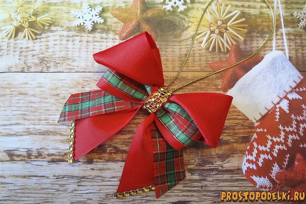 С приближение Нового года каждая семья пытается украсить свой дом, сделать его уютным, тёплым и уникальным. Символ Нового года является ёлка. Для того, чтобы наша лесная красавица была уникальной и выглядела ярко я предлагаю использовать новогодние бантики. Подобные украшения продаются в магазинах, но интереснее сделать их самим. Их можно вешать не только на ёлку, но и использовать как декор всей квартиры, а также они подойдут в качестве подарка. Для одного бантика нам понадобится: Как сделать новогодний бантик: Для начала начинаем делать верхнюю часть бантика. Для этого нам понадобится 2 отрезка красной репсовой ленты. Отрезки должны быть длиной по 21 см. Края ленты опаливаем огнём. Берём один отрезок ленты, складываем его пополам, намечаем середину. Затем от середины загибаем один край ленты вниз, потом другой. Образуется треугольная верхушка и мы ее опускаем вниз на себя. Деталь переворачиваем. Перевёрнутую заготовку складываем пополам и фиксируем невидимкой или зажимом. Таким же об