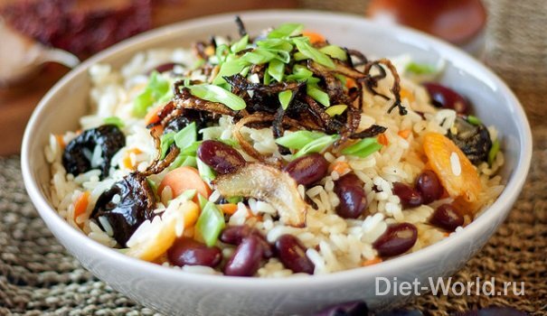 Подают вегетарианский плов со свежей зеленью. Ингредиенты: рис басмати (около 60гр на порцию) — 1 стакан
