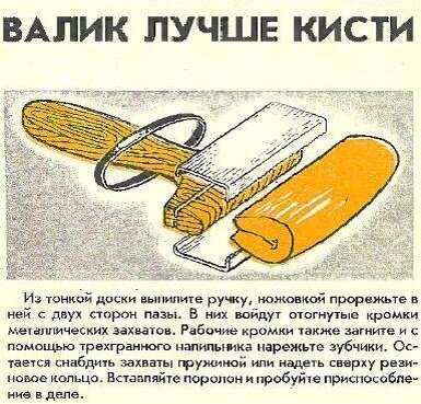 В Советском Союзе издавалась большое количество литературы, посвященное различным техническим или домашним самоделкам. Многие из этих самоделок не потеряли своей актуальности и сегодня. Ниже представлено описание изготовление трех самоделок, опубликованных в разных советских журналах и сборниках. Кисть из поролона. Для изготовления такой кисти вам понадобятся: 1.Кусок поролона. 2.Канцелярский зажим для бумаг. 3.Два шурупа. 4.Дощечка. Дощечку можно заменить ручкой от старой кисти. В канцелярском зажиме сверлится два отверстия. Затем с помощью шурупов зажим крепится к ручке кисти. Полоска поролона складывается в несколько слоев и помещается в зажим. Кисть из поролона готова к использованию. Такую кисть не нужно мыть - засохший поролон просто заменяется новым. Зажим для наждачной бумаги. Наждачная бумага применяется при обработке поверхностей различных материалов. При этом домашний мастер обычно оборачивает наждачной бумагой подходящий брусок. Но для этих целей можно изготовить несл