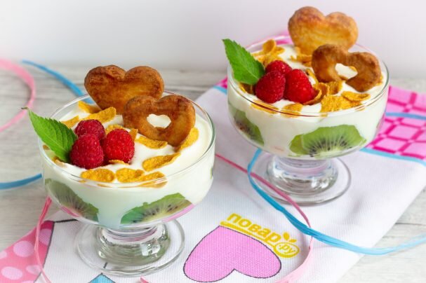 Изысканный десерт, который может удивить детей или стать красивой точкой романтического ужина! Готовится легко и просто, а выглядит весьма загадочно и интересно! Обязательно попробуйте! Ингредиенты: Киви — 2 Штуки Хлопья кукурузные — 50 Грамм Сыр сливочный — 200 Грамм Сливки — 50 Миллилитров Сахарная пудра — 50 Грамм Тесто — 50 Грамм (песочное или слоеное, по желанию - для украшения десерта) Количество порций: 2 Приготовление: 1. Подготовьте все необходимые ингредиенты. 2. Подготовьте крем. Сыр взбейте миксером со сливками и сахарной пудрой до воздушности. 3. Очистите киви. Нарежьте полукругом и кругом. Круги выложите на дно креманки или бокала, а полукругом выложите бортик. 4. Добавьте крем и посыпьте хлопьями. 5. Остатки киви нарежьте кусочками и положите на хлопья. 6. Затем снова крем и хлопья. 7. Десерт готов, осталось украсить по своему вкусу. Я заранее испекла печенье в виде сердечек из песочного теста. Также использовала листики мяты и свежую малину. Приятного аппети
