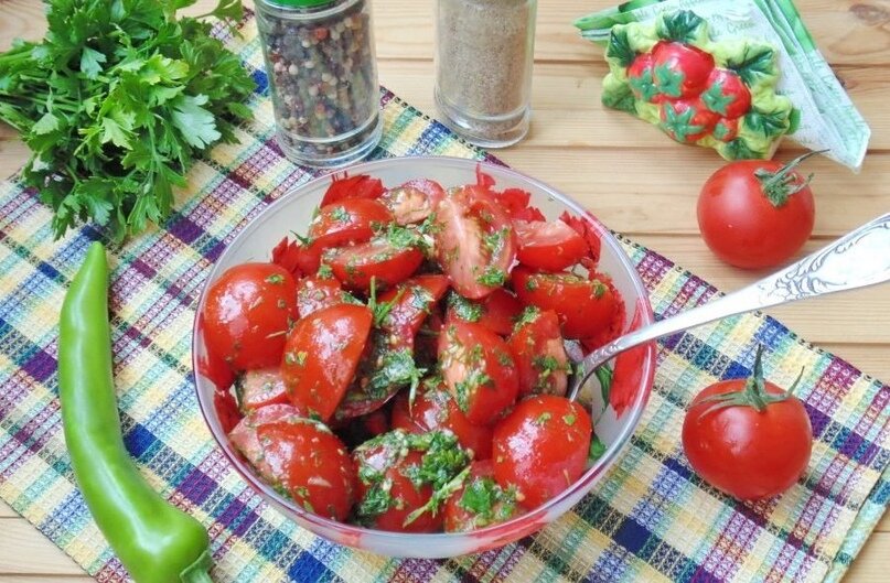 Помидор — 500 г Чеснок — 2–3 зубчика Укроп — 10 г Соль — 0,5 Чайных ложки Сахар — 1 ст. л. Уксус 9% — 1 ст. л. Соевый соус — 2–3 ст. л. Подсолнечное масло — 2–3 ст. л. Петрушка — 10 г