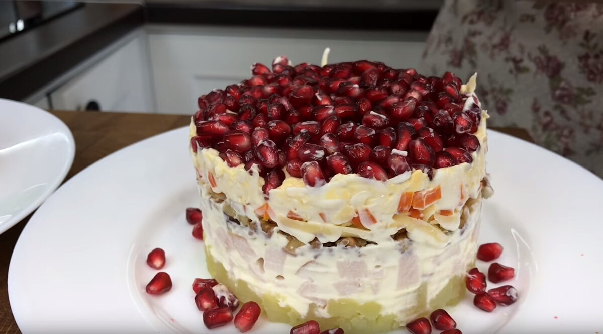 Всем привет. Это канал "Самые вкусные рецепты". Сегодня будем готовить вот такой красивый салат. Изначально этот салат украшали гранатом, но мы еще украсили клюквой, что придало ему свой необычный вкус. Делать будем в двух вариантах. Получится вкусно, здорово и красиво. Начинаем! Нам понадобится: Картофель 300 г. Морковь 300 г. Грецкий орех 50 г. Сыр 150 г. Курица копченая 300 г. Майонез Гранат и клюква Яйца 3 шт. Соль Для формирования салата возьмем тарелку и формовочное кольцо. Мелко нарезаем ножом картофель. Укладываем картофель на дно. Немного придавливаем картофель и чуть-чуть подсолим. Смазываем майонезом. Мясо нарезаем кубиками. (Как вариант, можете взять ветчину). Вторым слоем отправляем мясо и тоже притрамбовываем. Смазываем майонезом. Орехи рубим ножом или в блендере и распределяем ровным слоем. Сыр натираем на крупной терке. Сверху орехов выкладываем сыр. Морковь как и картофель режем кубиками и выкладываем на сыр. Смазываем майонезом. Натираем яйца на мелкой тёрке, доб