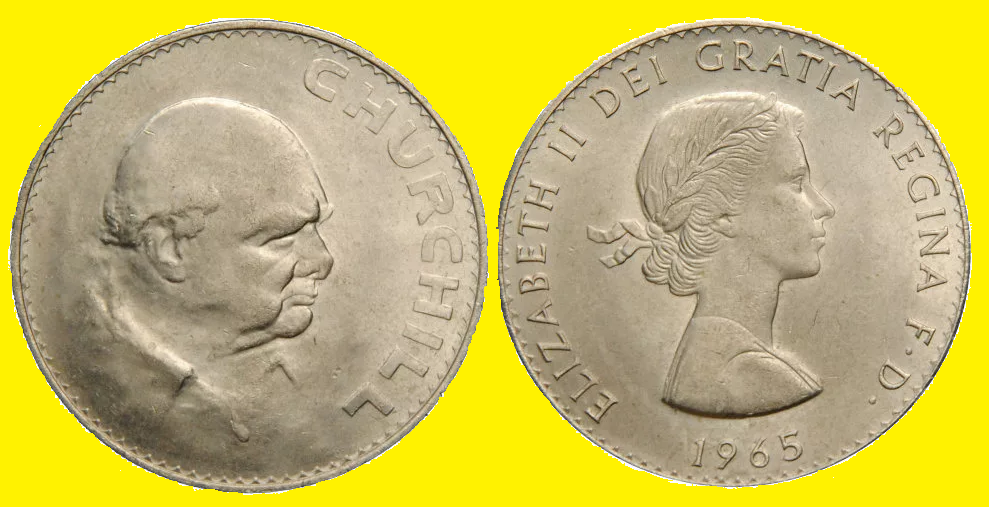 1965 году 24 января скончался Британский государственный и политический деятель. В марте того же года принято решение о чеканке монеты номиналов в 5 шиллингов (1 крона) в честь Уинстона Черчилля . 3 августа 1965 года была напечатана королевская декларация,в ней был утверждён дизайн новой монеты. В сентября того же года была отчеканена первая партия монет. Монеты чеканились приблизительно 1 млн. штук в неделю. Первые образцы монет появились в банках Великобритании 11 октября 1965 г. И,даже не смотря на высокий тираж (19 640 000 шт.), первые несколько месяцев была острая нехватка таких монет из-за очень высокого спроса. Впервые в истории Британии на законном платёжном средстве появилась изображение человека, не королевской крови.