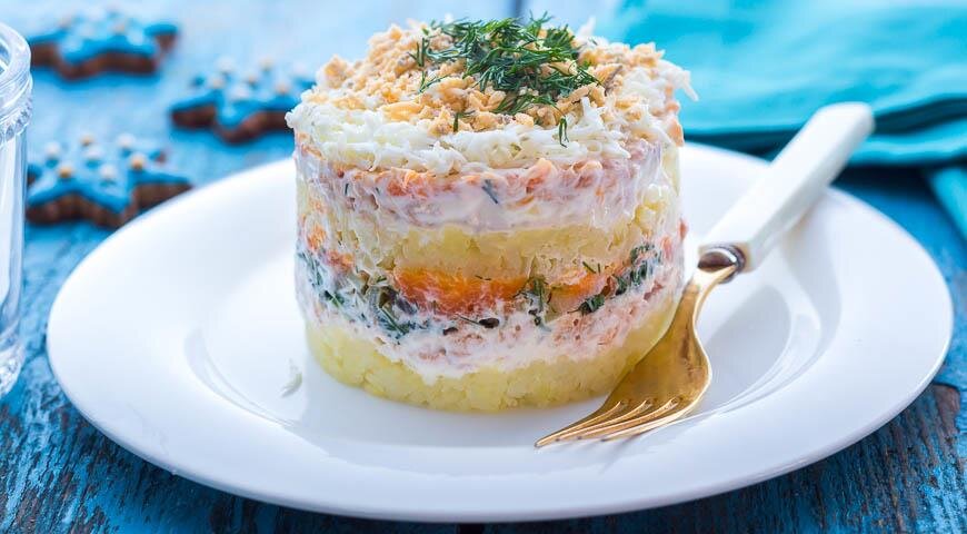 Например консервы заменяем на рыбу холодного копчения, берем сырный продукт в плавленном виде вместо твердого, и в связи с этим не используем майонез. Этот пункт меня особо воодушевляет!!! Салат с плавленным сыром и горбушей холодного копчения Нам понадобится: Двести грамм горбуши холодного копчения Двести грамм «жидкого» плавленного сыра «Очаковский» или «Дружба» Три-четыре картошки средние Четыре яйца Небольшая морковь Лук зеленый и петрушка по вкусу Приготовление: 1. Сначала отвариваем или готовим «пакетным» способом в микроволновке картофель и морковь в мундире.
