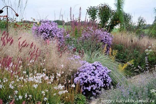 Есть 3 сорта, названий которых не знаю. Низкая может быть и симфиотрихумом кустарниковым. Прекрасный компактный сорт, сантиметров 20 высотой, в тон более высокому не определенному розовому сорту симфиотрихума ново-бельгийского. Они оба как раз на верхней картинке. Цветут они одновременно, в сентябре. На дачной глине высокие симфиотрихумы ново-бельгийские стоят кустом, не разваливаются, на немецком суглинке расползаются и разваливаются. Этот высокий розовый сорт имеет цветки холодного насыщенного оттенка. Когда отцветает, становится нежно-розовым, тоже холодным. Такие же метаморфозы происходят и с голубым симфиотрихумом. Высокие, и розовый, и голубой, подвержены мучнистой росе. Можно обрезать сразу после отцветания, а можно оставить стоять в надежде на красивую картинку в заморозки (против мучнистой росы ра
