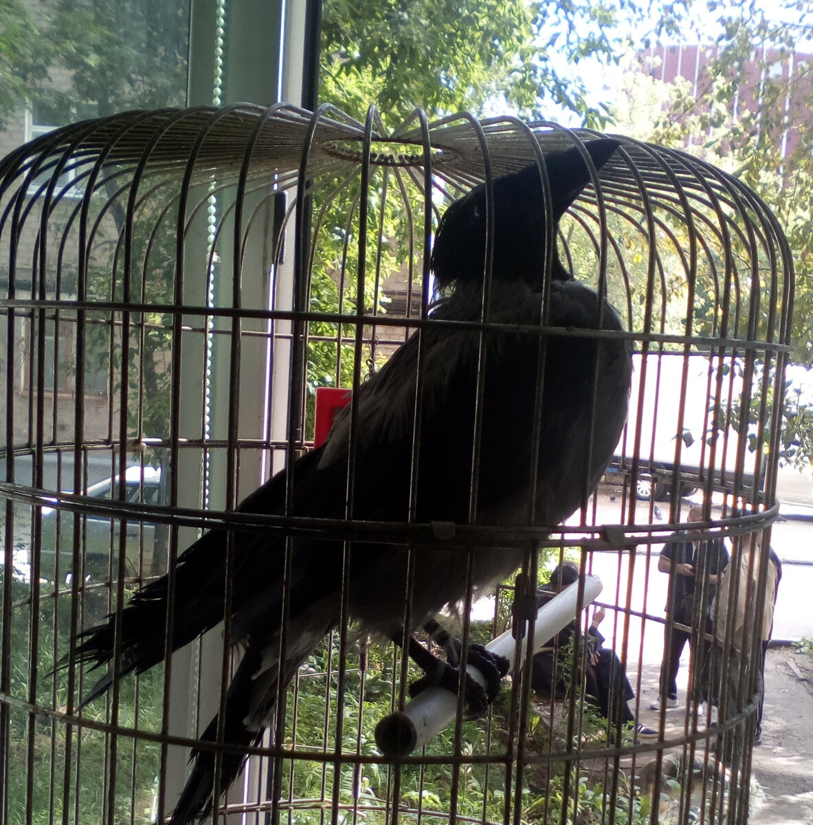 Феноменально умная птица - ворона! Раньше подозревала это. Теперь уверена. Гениальная, мистическая, хитрая, своенравная и преданная... Не знала этого до тех пор, пока серая бестия не поселилась в моем доме. Сижу на праздновании дня рождения подруги, вдруг - звонок: "Мама, не сердись, я домой вороненка принес, он во время шторма упал и, кажется, лапки повредил"... Дома меня ждал вполне уже оперившийся птенец, крупненький и лупоглазый. Лапки у него, действительно, были деформированы. Решила, как только выправится, попробуем выпустить. Но уже два с лишним года ворона живет у нас. Попытки пристроить не удались, а лапки так и не выправились. Нет, когда она на палочке сидит, мало заметно, но когда начинает перемещаться, то... Ну да ладно, живет ворона и живет. Только это вызывает безумное недоумение у людей. А я уже привыкла. Даже полюбила эту чистюлю. Каждое утро приходится наливать в корытце воду и ставить ей в клетку, чтобы она привела себя в порядок. Карлуше безумно нравится плескаться