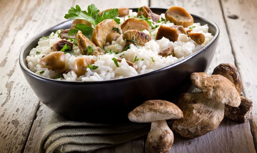 Ингредиенты: Белые грибы – 6 – 8 шт.; Рис – 2 ст.; Сливочное масло – 100 гр.; Лук репчатый – 1 шт.; Сыр - 50 гр.; Зелень петрушки - 1 пучок; Соль - по вкусу. Способ приготовления: Рис приготовить следующим способом: взять эмалированную чугунную кастрюлю, высыпать в нее рис и поставить на горячую плиту, чтобы рис немного согрелся, и положить в него кусок сливочного масла. Затем залить самым крутым кипятком (на 2 стакана риса—4 стакана кипятка). Посолить рис, перемешать, закрыть кастрюлю крышкой и поставить в духовой шкаф. Когда вода выкипит и рис станет мягким, то вынуть его из духового шкафа, чтобы он не пересох, положить в него еще кусок сливочного масла, перемешать и поставить на край плиты. Взять 6 – 8 белых грибов, облить кипятком, дать постоять 20 минут в кипятке и промыть. Грибы нарезать на небольшие куски, переложить в небольшую кастрюлю, налить горячей или холодной воды, немного посолить и поставить на плиту. Когда грибы сварятся до мягкости, вынуть их из воды (грибной отвар