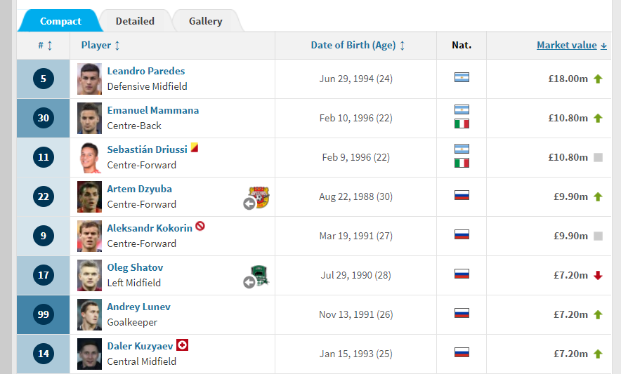 На первом месте - Леонардо Паредес. Купленный за 20 млн. футнов год назад на деньги, полученные от продажи Халка и Витцеля, сегодня он стоит 18 млн. фунтов. На втором месте травмированный центральный аргентинский защитник Эмануэль Маммана. Цена всего лишь 10 мнл. фунтов. На третьем месте ещё один аргентинец - Себастьян Дриусси. Цена как и у Мамманны - 10 млн. фунтов. На четвертом месте легенда Российского футбола и Зенита - Аааааааартёёёёёммм ДзююююююююБааааааа! Цена 9 мнл. фунтов. И замыкает ТОП-5 списка центральный форвард Бутырской тюрьмы - Александр(Саня) Кокорин.