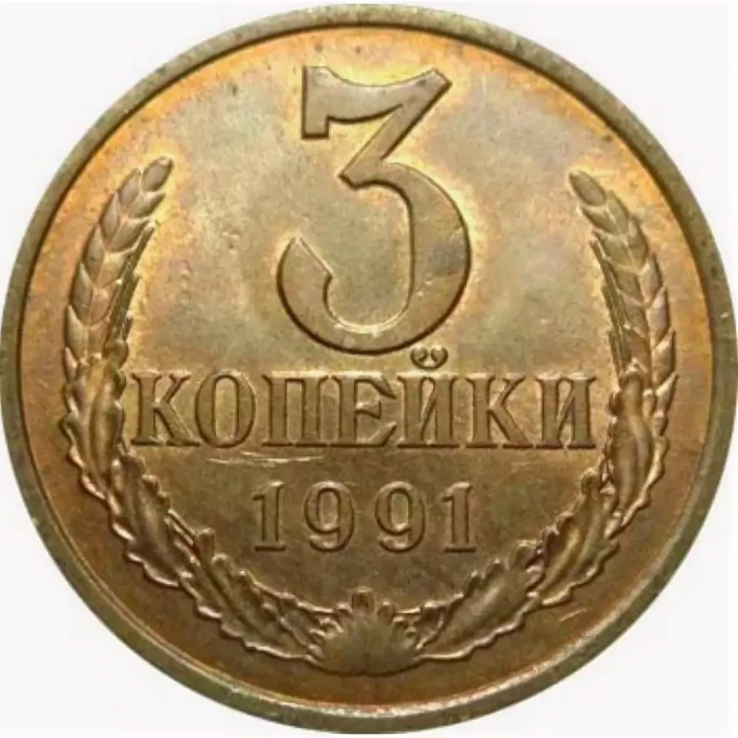 Почти все монеты, выпущенные в период финансовой нестабильности 90-х годов, имели низкую покупательскую способность: не стали исключением и три копейки 1991 года. Деньги этого номинала начали чеканить еще в 1926 году и на протяжении всей шестидесятипятилетней истории параметры и характеристики трех копеек практически не менялись: все те же 22 мм в диаметре и постоянный вес, равный трём граммам. Основные различия можно заметить в оформлении аверса и реверса – различные шрифты, число витков ленты, которой перевязаны колоски в гербе CCCР, отличные детали в чеканке мелких элементов композиции лицевой и оборотной сторон. Главной отличительной особенностью трехкопеечных монет 1991 года чеканки можно назвать клеймо монетного двора, появившееся на монетах именно в этом году – это маленькие буквы Л или М справа от государственного герба на аверсе. Несмотря на то, что покупательская способность трех копеек была почти нулевой, они пробыли в обращении, оставаясь полноценными деньгами, вплоть до 19
