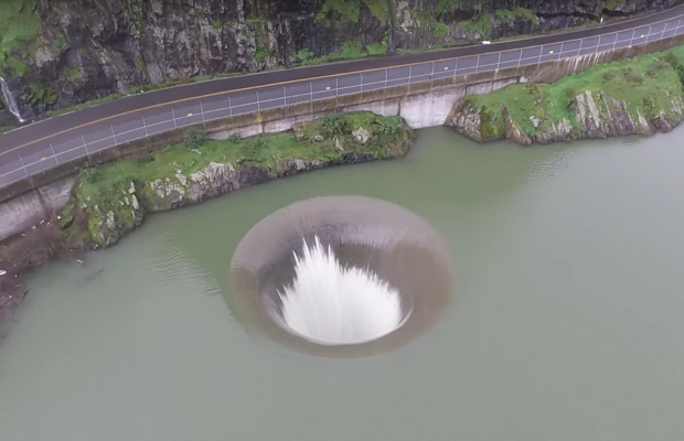 Объём воды в водохранилищах крупных дамб имеет свойство регулярно повышаться вследствие дождей. Если не производить слив таких избыточных вод, может произойти затопление окружающего участка суши. Во время слива возникает центральный водоворот, к которому очень опасно приближаться. Сезон дождей в штате Калифорния вызвал переполнение местных водохранилищ, что несло угрозу окружающим населённым пунктам. Однако, значительный объём накопившихся вод послужил сигналом к запуску систем водяного сброса, специально созданных инженерами для контроля уровня воды в водохранилищах. Во время слива накопившихся вод возникают искусственные водяные воронки, в одну из которых и удалось заглянуть камере. Соответствующие кадры можно посмотреть на прилагающемся видео. Каждую секунду через сливной водоворот спускается около 1200 кубических метров вод. Во время работы сливных инженерных сооружений перекрывается доступ к ним для посторонних, в том числе перекрываются ближайшие участки автотрасс.