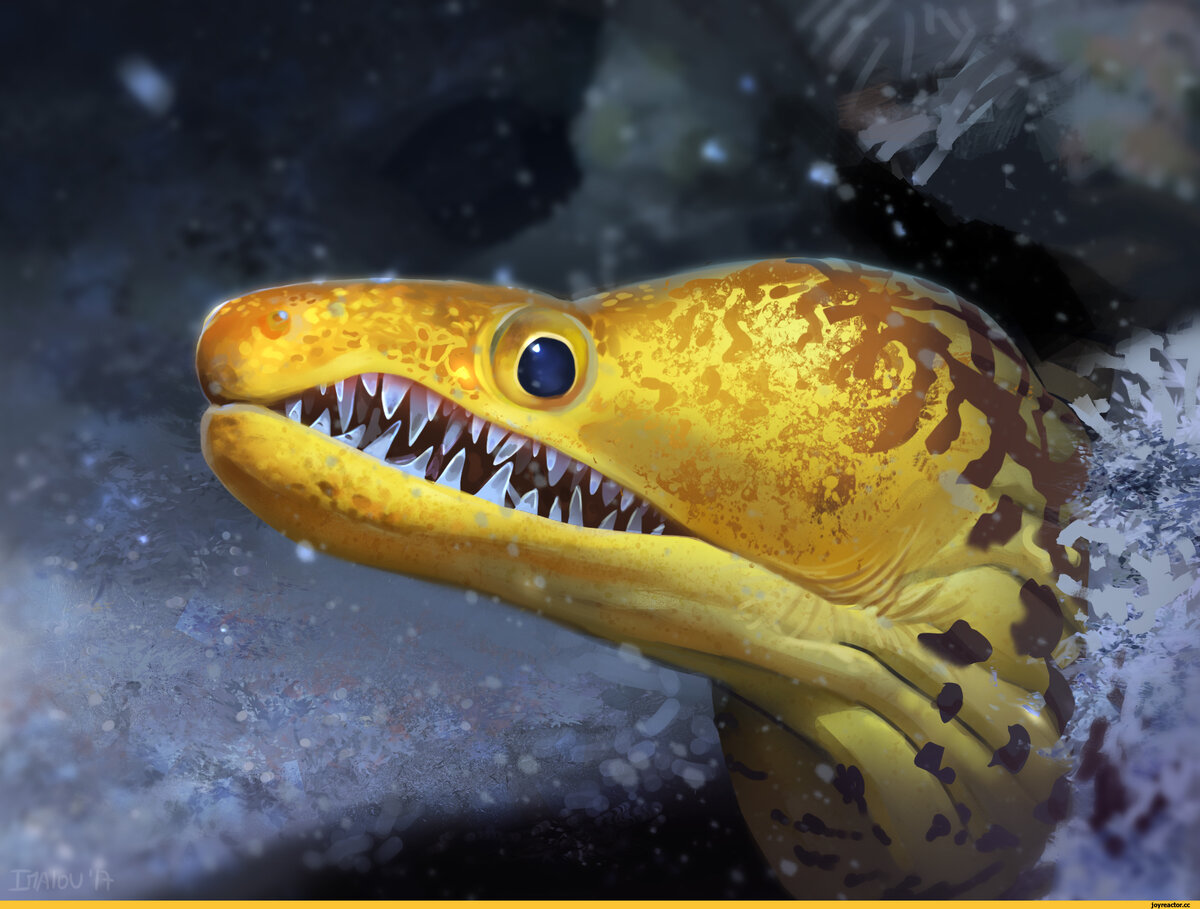 Эта огромная страшная рыбина очень напоминает змею и не только очертаниями вытянутого тела. Как все угреобразные, мурена плавает и ползает, как истинная змея, заметно изгибая туловище. У нее маленькие глазки, постоянно распахнутая пасть, острые загнутые зубы, змеевидное туловище без чешуи. Мурены могут достигать трех метров в длину и весить до 50 кг, но чаще всего встречаются особи длиной около одного метра. Самым крупным представителем семейства является вид Strophidonsathete. Эти рыбы вырастают в длину до 4 метров. В ожидании жертвы мурена практически замирает, но никогда не закрывает рот. У мурен нет языка, но природа восполнила этот недочет, наградив их двумя парами ноздрей, напоминающих небольшие трубочки. Ноздри муренам нужны для того, чтобы ощущать запахи. Превосходное обоняние мурены в какой-то мере компенсирует возможности ее слабого зрительного аппарата.