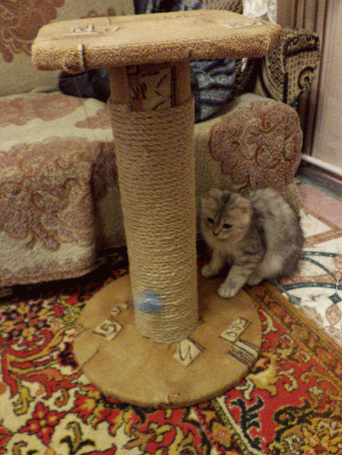 Здравствуйте, расскажу я вам как собрать когтеточку ценой в 400 рублей) Прежде всего скажу, когда её собирал не думал, что кот будет играться) Но... Итак: Нам потребуется материал: 1. Труба канализационная 100 диаметр. В моём случае я использовал картонную бобышку из под линолеума) 2. Джутовый канат. 3. Термоклей 4. Кнопки канцелярские 5. Капроновая нить 6. ДСП или фанера 2 шт 7. Ковролин (абсолютно любой) 8. Саморезы Инструмент: 1. Шуруповерт 2. Лобзик 3. Степлер 4. Термопистолет Приступим: 1. Необходимо напилить дсп. В моём случае я пилил круг и квадрат. Делаем это лобзиком. 2. Надо выпилить два кружочка из дсп, диаметр должен быть как труба. 3. Засовываем кружочки из пункта 2 в трубы и прикручиваем саморезами с боковин трубы. 4. Кружочек я обтянул ковролином в первую очередь при помощи степлера и прикрутил к трубе. 5. Берем канат и при помощи термоклея плотно прикручиваем и одновременно приклеиваем к трубе. В начале и в конце каната я вставил кнопку. Так для красоты) 6. Прикручива