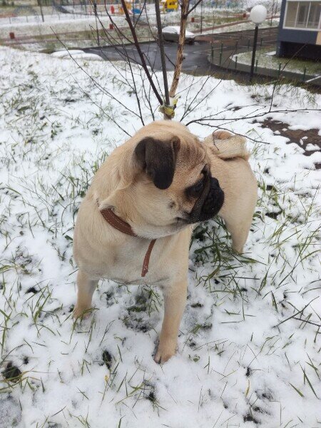 Всем привет! Это мой первый снег. Сегодня ловил белых мушек и оставлял следы! Это было очень интересно, снег такой вкусный! мой язык немного замерз, хозяйка ругается. Мерзну ли я, спросите ли Вы? Пока нет, а вот когда на градуснике стукнет (-10) градусов, то нужно будет приодеться. Как только появится ледовая корочка, срочно нужен воск для лапок, он не замерзает. Нооо...хозяйка снова нашла лайфхак - вазелин, да,да! Обычный аптечный вазелин. По консистенции немного жиже, чем воск, но в разы дешевле))