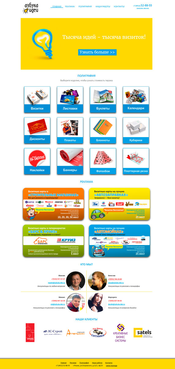 Это сайт компании, оказывающей помощь бизнесу в его продвижении при помощи визуальной рекламы. Мы перенесли в виртуальное пространство их основные идеи, сделали все так же ярко и заметно, с примерами работ и четким разделением продуктов по группам, чтобы было максимально удобно. Создание сайтов в Рязани такого уровня достаточно востребовано, здесь идеально сочетается приемлемая цена и высокое качество. Объект привлекает к себе внимание, выглядит в каком-то смысле просто, не заставляет напрягать зрение большим количеством ярких участков. Заказ продукции происходит в офисе компании, а это виртуальная витрина, показывающая все возможности исполнителя. Общаясь с такой компанией у заказчика, всегда возникает много технических вопросов, они отнимают время, чтобы минимизировать эти затраты мы позаботились о наличии подразделов с подробным указанием таких данных. Если кого-то интересует создание сайтов в Рязани с таким же ярким и привлекательным дизайном, мы готовы обсудить детали, а цена на
