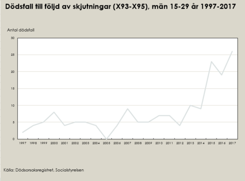 В 2017 году 26 шведов в возрасте от 15 до 29 лет умерли от огнестрельных травм. На это указывают новые статистические данные Национального совета по вопросам здравоохранения и социального обеспечения Швеции. Это самый высокий показатель с начала сбора подобных статистических данных в 1987 году. Среди молодых людей это прежде всего перестрелки с фатальным исходом. В прошлом году в этой возрастной группе было 26 таких смертельных случаев. Всего в Швеции в 2017 году произошло 37 убийств. "За последние три года число смертей среди молодых мужчин в возрасте 15-29 лет значительно выше, чем в предыдущие годы. В период с 2000 по 2014 год огнестрельные травмы в среднем приводили к почти шести смертельным случаям в год в этой возрастной категории", - говорит представитель Национального совета по вопросам здравоохранения и социального обеспечения Швеции (Socialstyrelsen) Jesper Hörnblad. Число смертей среди молодых мужчин в Швеции более чем в два раза выше, чем в сопоставимых странах, показывает